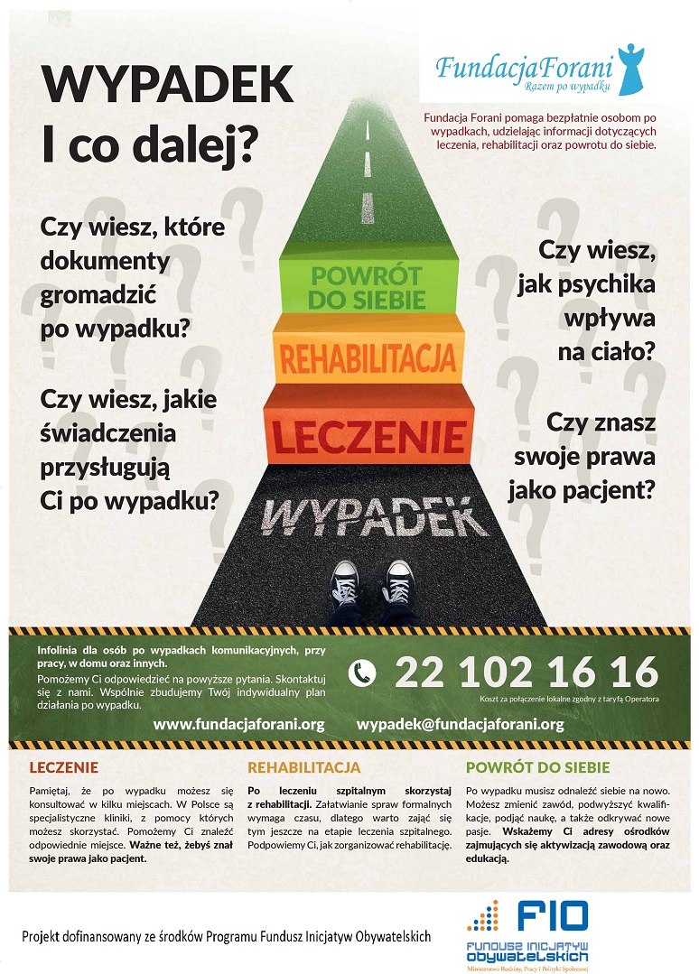 Fundacja Forani jest realizatorem projektu „Wypadek i co dalej?” w ramach którego udziela wsparcia dla osób poszkodowanych w wypadkach i ich bliskich. Zapraszamy wszystkie osoby potrzebujące pomocy do kontaktu z Fundacją.