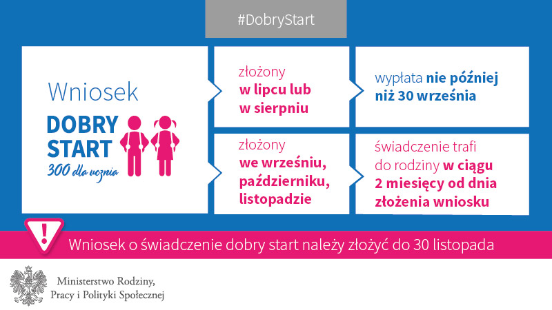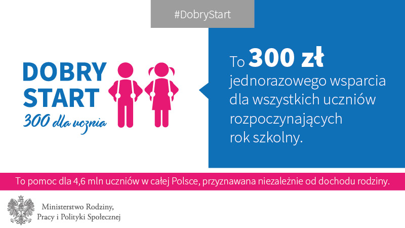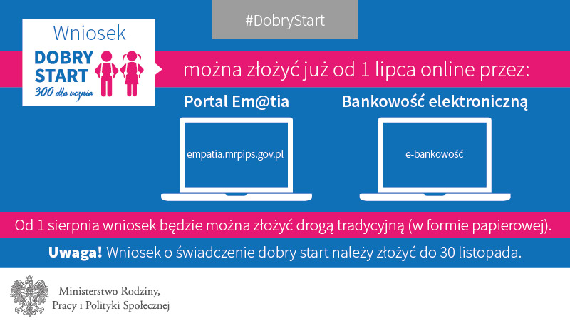 W związku z wejściem w życie z dniem 1 czerwca 2018r. rozporządzenia Rady Ministrów z dnia 30 maja 2018r. w sprawie szczegółowych warunków realizacji rządowego programu "Dobry start" (Dz. U. poz. 1061) wnioski o świadczenie z Programu Rządowego "Dobry start" będzie można składać drogą elektroniczną poprzez bankowość elektroniczną i min
