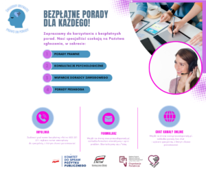 Zapraszamy do korzystania z bezpłatnego wsparcia specjalistów tj. Prawnika, Pedagoga, Psychologa oraz Doradcy Zawodowego.