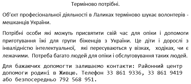 Zakład Aktywności Zawodowej w Lalikach PILNIE poszukuje WOLONTARIUSZY - również obywateli Ukrainy. Potrzebne są osoby, które chcą poświęcić swój czas na czynności opiekuńcze, porządkowe czy też pomocowe w przygotowaniu posiłków dla grupy uchodźców z Ukrainy. Są to dzieci i dorośli z niepełnosprawnościami intelektualnymi, leżące, poruszające się na wózkach inwalidzkich i przy pomocy chodzików. Ogrom opieki nad nimi wymaga zaangażowania wielu osób. Osoby chętne do pomocy zapraszamy do kontaktu z Powiatowym Centrum Pomocy Rodzinie w Żywcu, tel. 33 861 9336 lub 33 861 9419 lub mailowo pcpr_zywiec@op.pl lub bezpośrednio z ZAZ w Lalikach tel. 792 568 951.